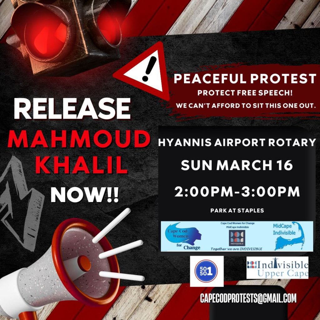 Release Mahmoud Khalil NOW! Sunday, March 16th, 2025 Time: 2:00PM-3:00PM Location: Hyannis Airport Rotary 499 Barnstable road, Hyannis ma (Park at: staples ) Organized by: Cape Cod Women for Change/Mid Cape Indivisible and Upper Cape Indivisible Email capecodprotests@gmail.com if you have any questions.