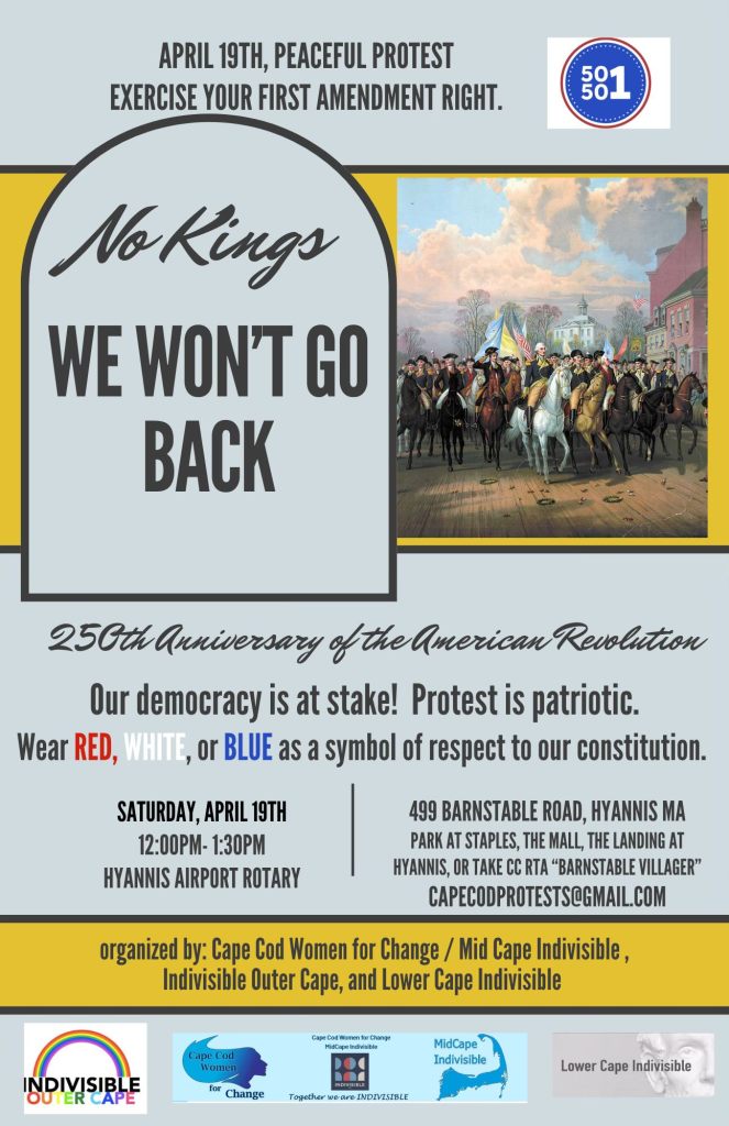 Location: Hyannis Airport Rotary, 499 Barnstable Road, Hyannis. Organized by: Cape Cod Women for Change/Mid Cape Indivisible, in partnership with Indivisible Outer Cape, Lower Cape Indivisible, and the national 50501 movement.