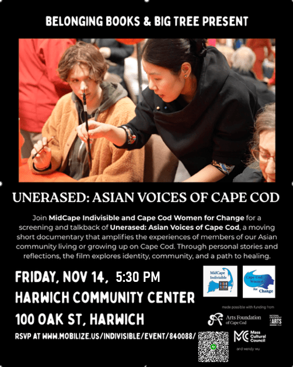 Erica Tso Haidas of Belonging Books (and Taiki Magyar and Izzi Caplan of Big Tree) will screen their collaborative documentary project, “Unerased: Asian Voices of Cape Cod.”