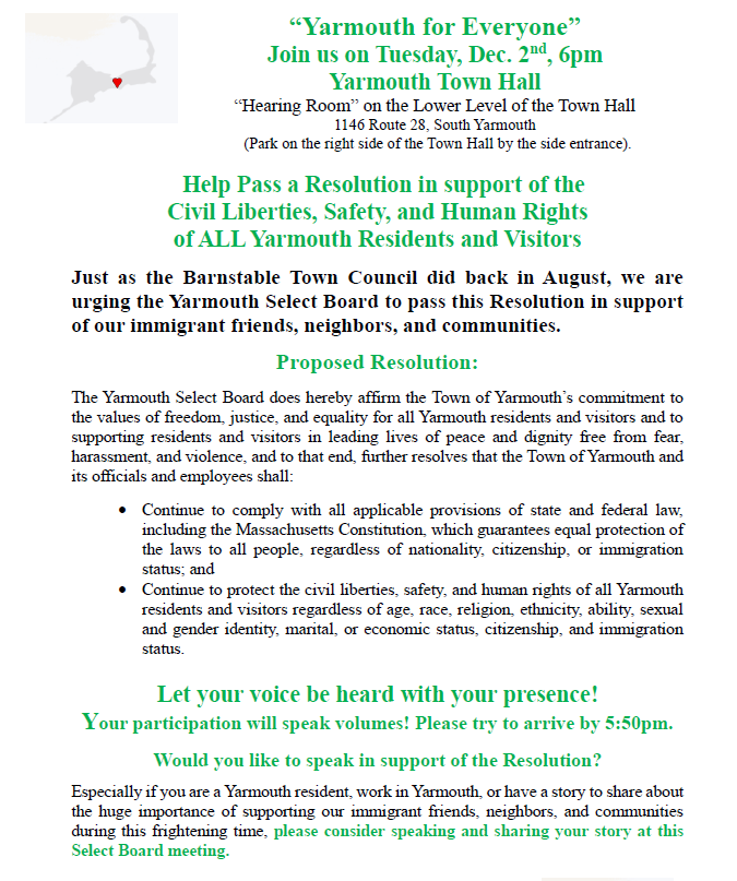 As you know, the wording of our resolution in support of the civil liberties, safety, and human rights of all Yarmouth residents and visitors regardless of immigration status is exactly the same wording as was passed by the Barnstable Town Council this past August. Intentionally, we are urging–in the Mid-Cape area–that the three towns stand together by affirming the same resolution. Once the resolution hopefully is passed in Yarmouth, we look forward to supporting our neighbors in Dennis with the adoption of their respective resolution.
