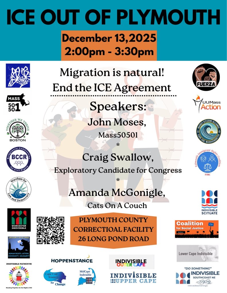 Join our big tent Indivisible protest Saturday, December 13, 2-3:30pm at Plymouth County Correctional Facility, 26 Long Pond Rd, Plymouth 02360 to DEMAND SHERIFF MCDONALD END ICE AGREEMENTS.
