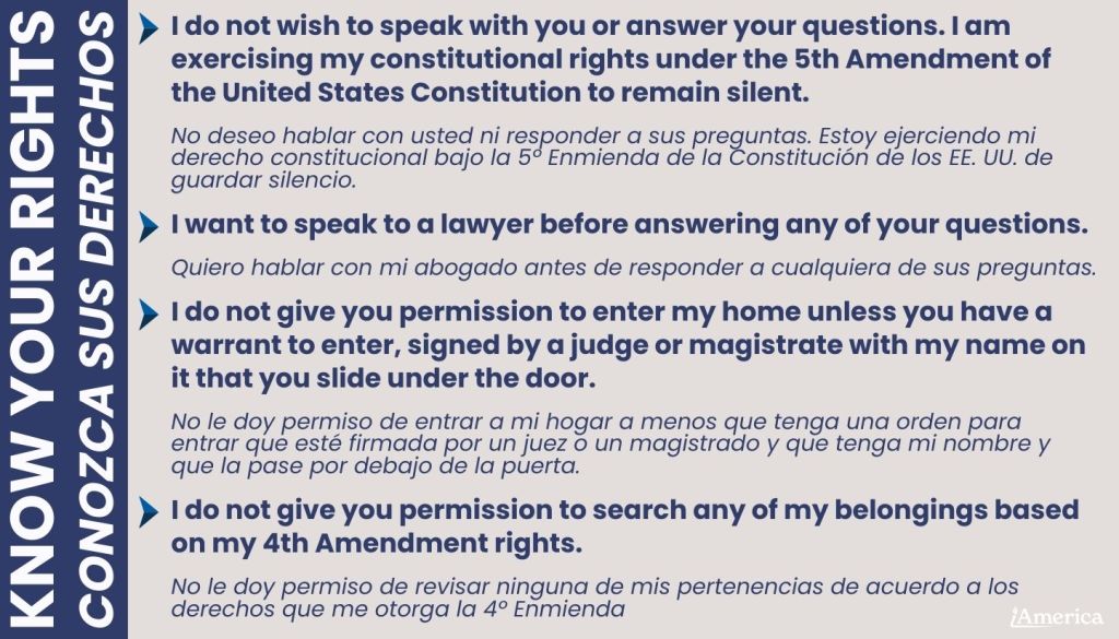 All people in the United States, regardless of immigration status, have certain rights and protections under the U.S. Constitution. The ILRC’s red cards give examples of how people can exercise these rights. However, they do not provide individualized legal advice. Community members are encouraged to check in with a trusted legal service provider for questions about their situation.